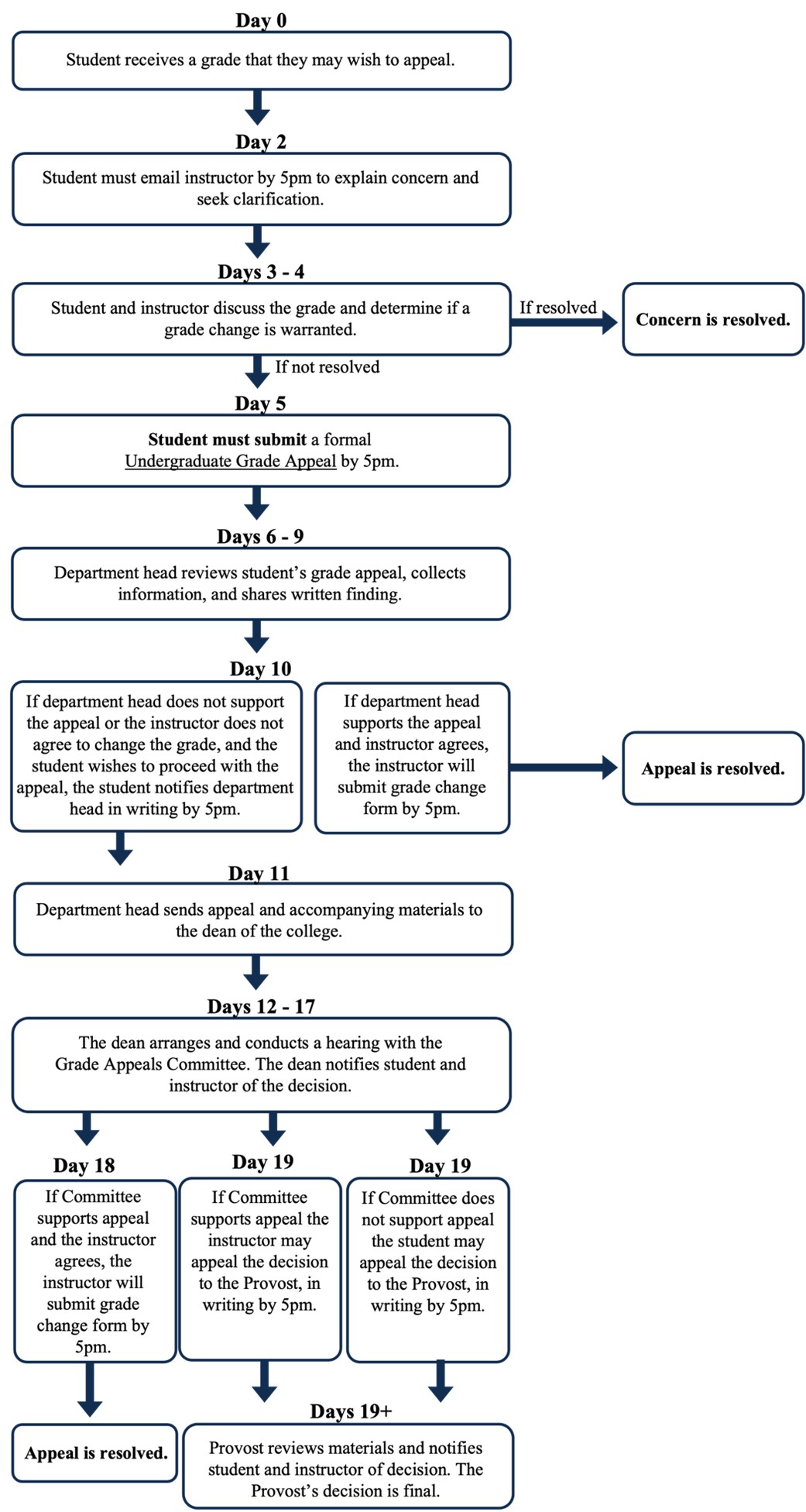 Note: In all cases pertaining to an Academic Grade Appeal, if a student appeals a grade assigned by an administrator in the chain of review (department head or dean or Provost), the review skips that administrative level. If the student appeals a grade for a course in which the Provost is the instructor, the Chancellor shall serve as the final level of review.